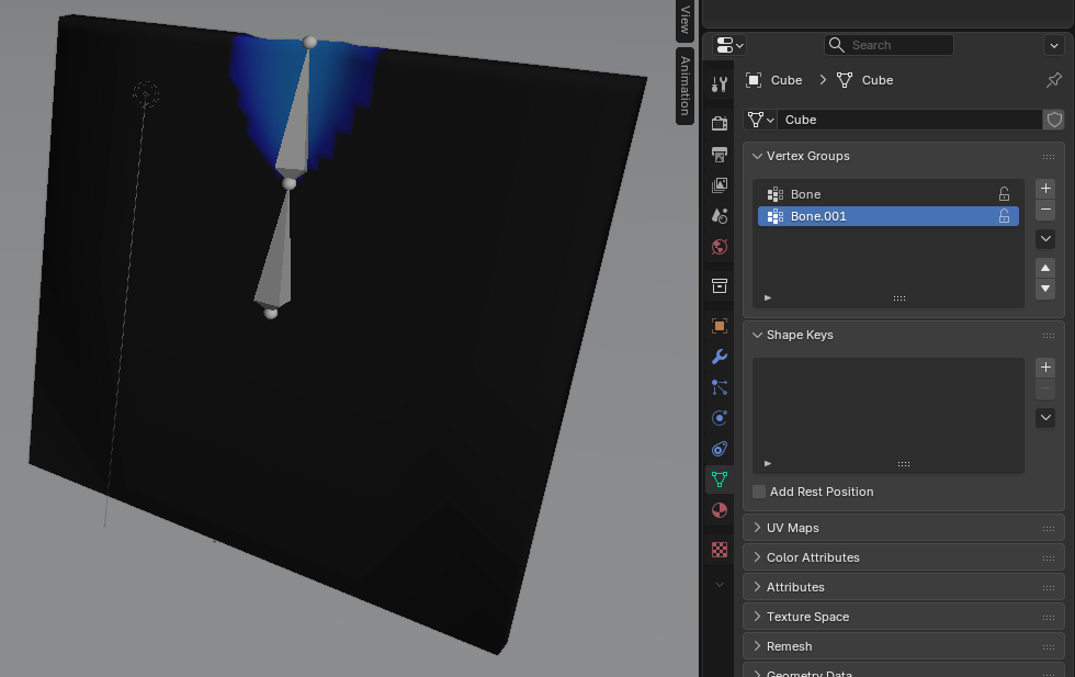 Next, I created the armature, starting with a root bone at the center and adding a second bone above it to bend the top edge. I parented the mesh to the armature using Automatic Weights.
